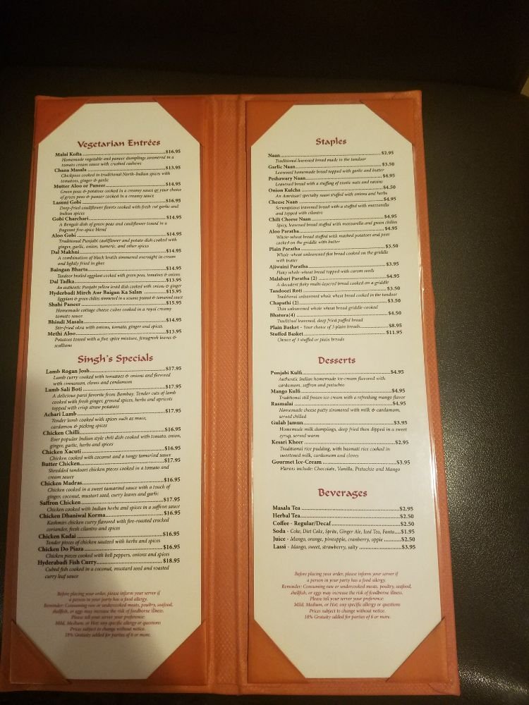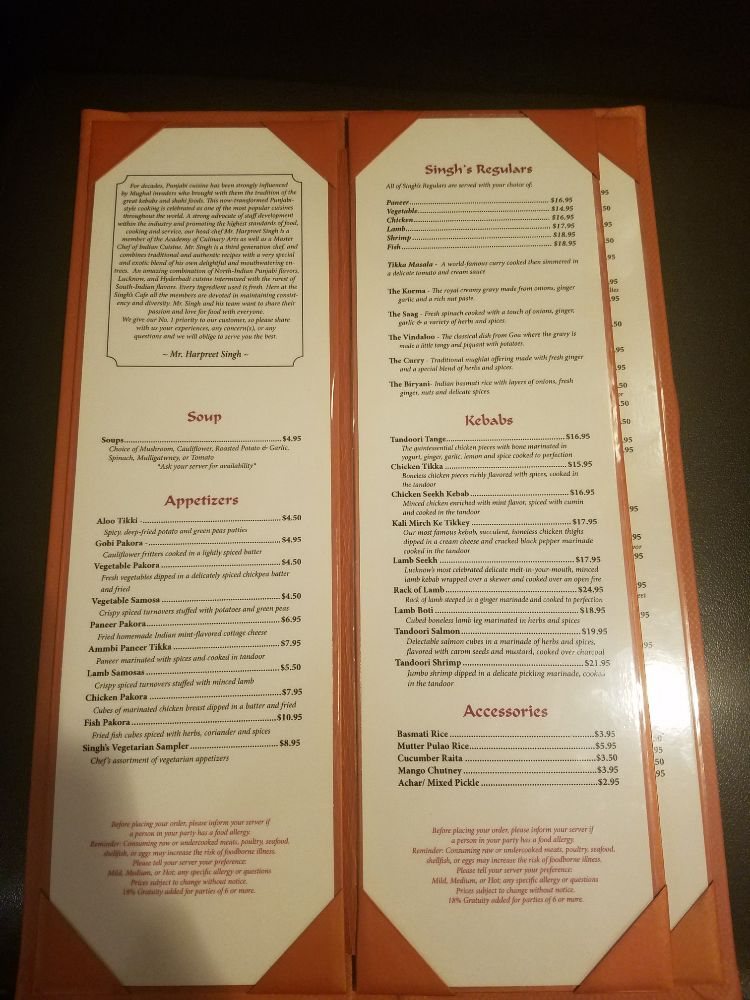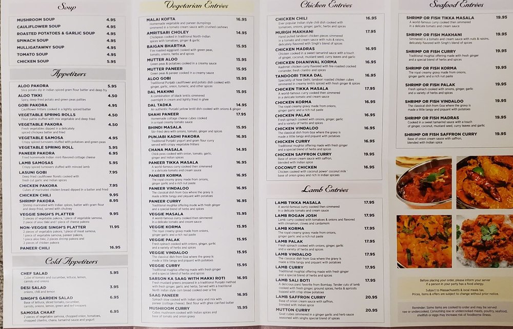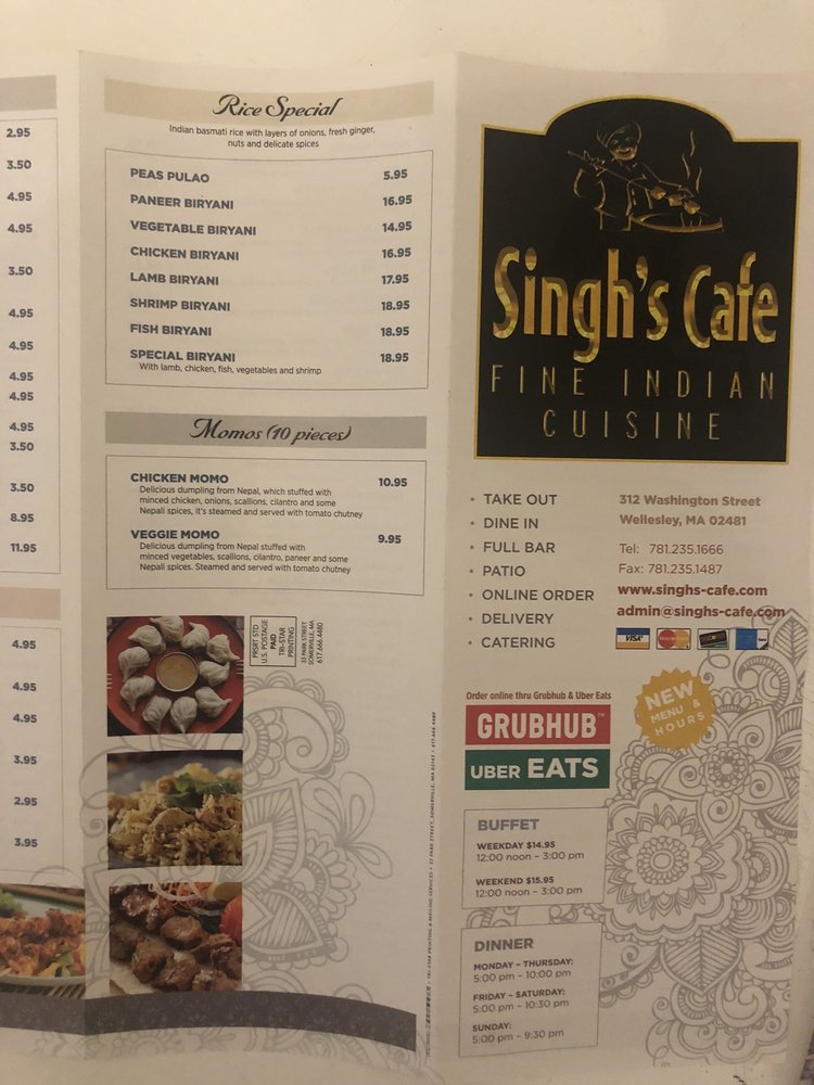 Singh's Cafe, located at 312 Washington St Wellesley, MA 02481, is a vibrant Indian restaurant that caters to a diverse range of dietary preferences. The menu features a variety of appetizers, including Aloo Pakora, Vegetable Spring Rolls, and Lamb Samosas, showcasing the rich flavors of Indian cuisine. The cold appetizers like Desi Salad and Singh's Garden Salad offer refreshing options for a lighter start.